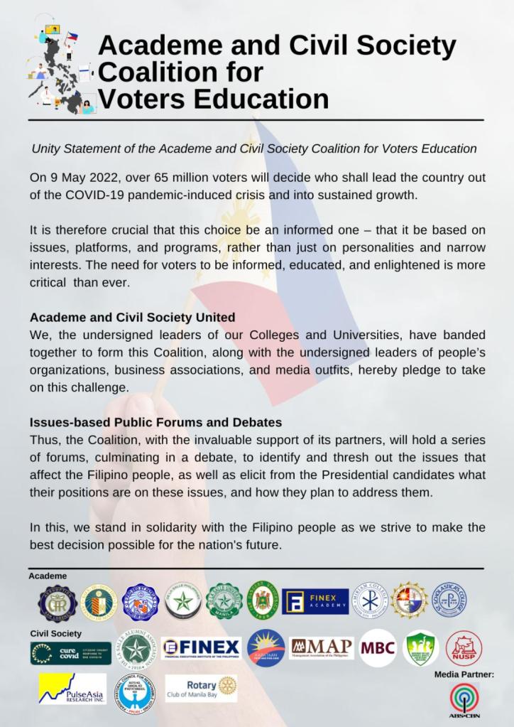 In a virtual meeting of heads of universities and colleges, civil society organizations, students’ organization and media partners, the Academe and Civil Society Coalition for Voters Education was officially formalized on 31 January 2022.