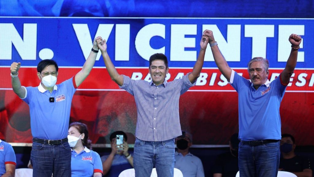 Matapos ang kanyang talumpati, itinaas ni “Bossing” ang mga kamay ng Lacson-Sotto tandem bilang simbolo ng pagsuporta.