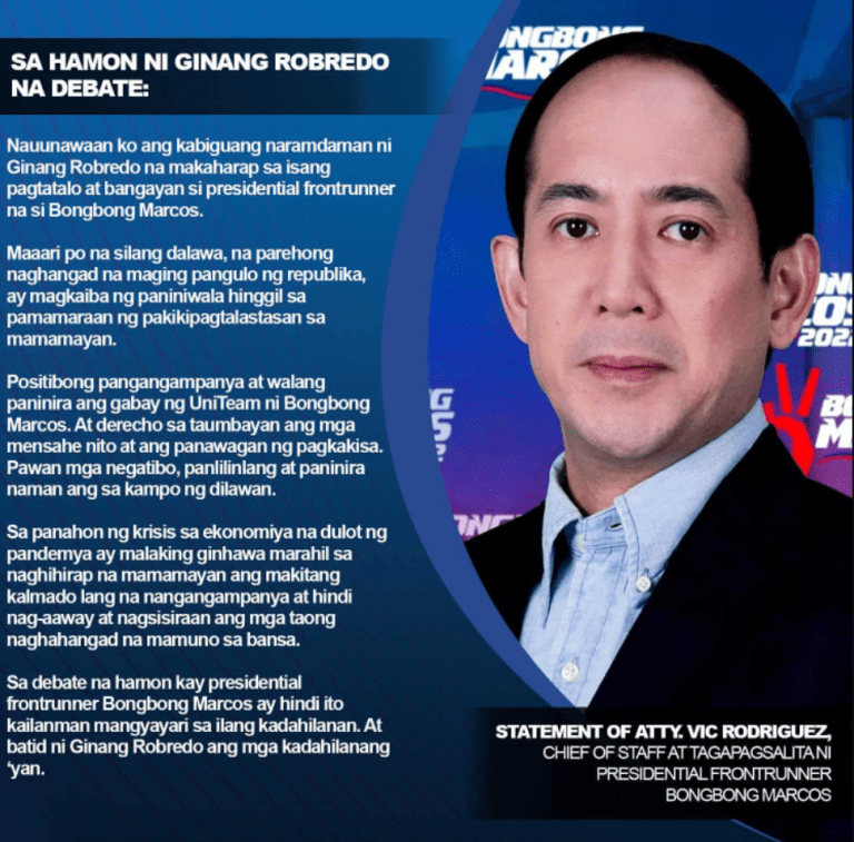 Sa inilabas na kalatas ni Atty. Vic Rodriguez, tagapagsalita ni Marcos, hindi anila tinatanggap ang hamon dahil sa mga umano’y ‘kadahilanang alam na raw ni ito ni Robredo’.
