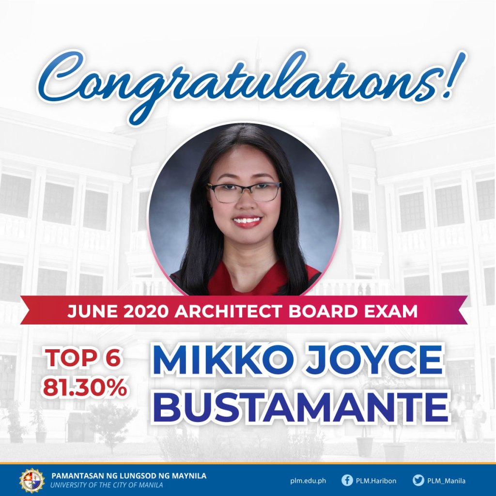 Sinabi ni University President Emmanuel Leyco na sa 3,037 pumasa sa pagsusulit, nakuha ni PLM College of Architecture and Urban Planning (CAUP) alumna Mikko Joyce Bustamante ang pang- 6 na puwesto sa nakuhang 81.30%.