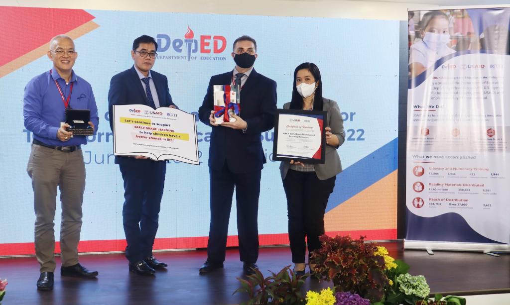 USAID Director of the Regional Financial Services Center Bret Campbell led the turnover to DepEd Undersecretaries Nepomuceno Malaluan and Diosdado San Antonio. The resources included USAID-developed teacher training materials, literacy and numeracy packages, early grade reading materials, and materials supporting literacy assessment.