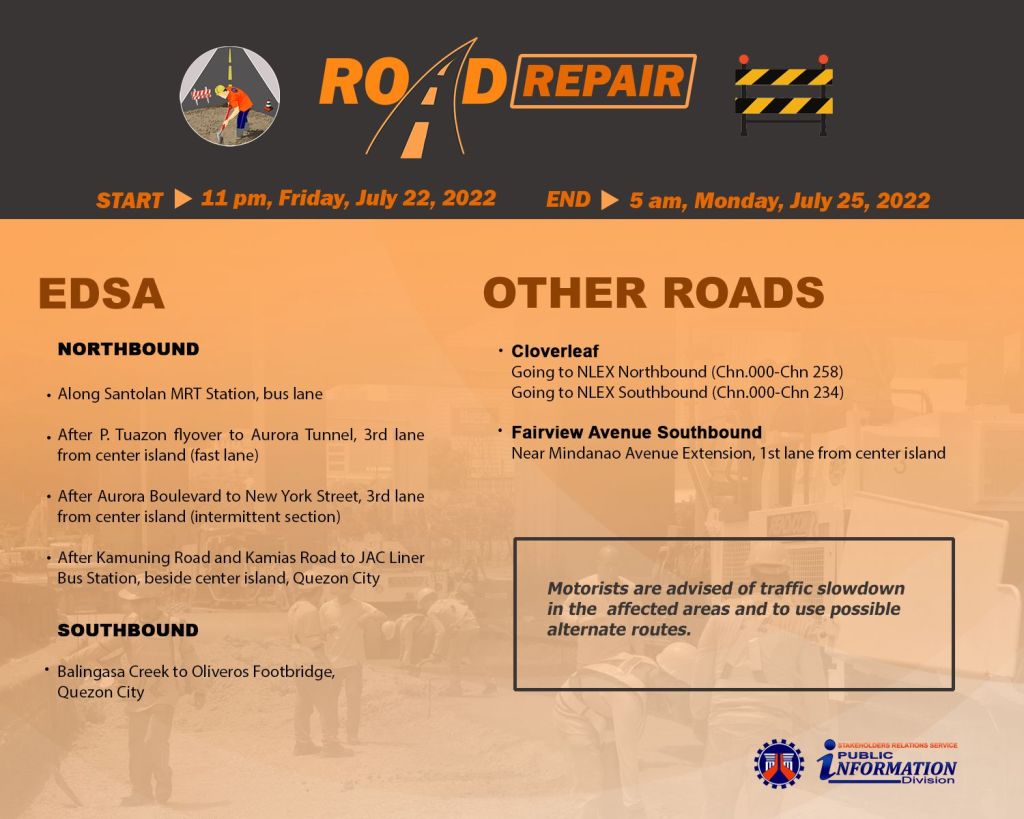 Samantala, sasailalim din sa repair works sa Quezon City sa Fairview Avenue Southbound malapit sa Mindanao Avenue Extension, 1st lane mula sa center island; Cloverleaf (CHN.000 – CHN 258) patungo sa NLEX Northbound; at Cloverleaf (CHN.000 – CHN 234) patungo sa NLEX Southbound.
