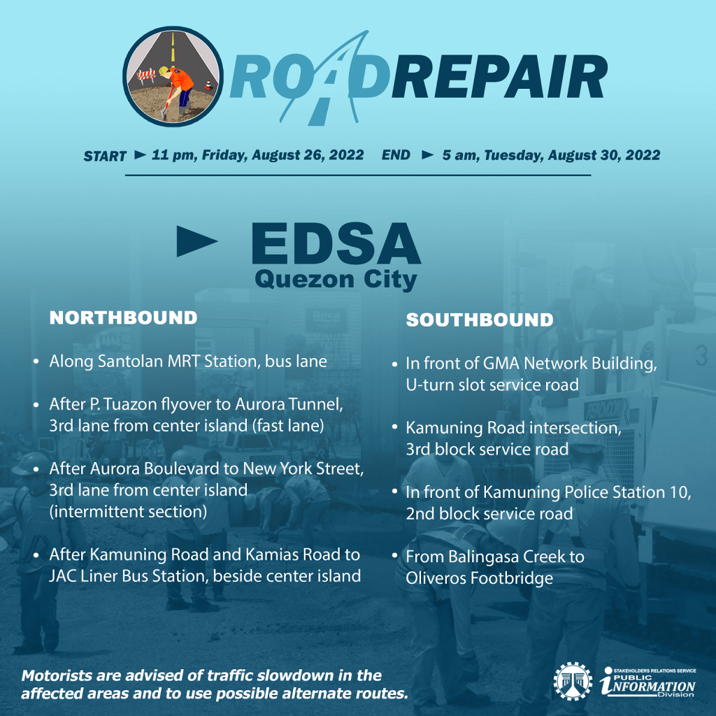 Maaapektuhan ang EDSA Southbound sa harap ng GMA Network Building, U-turn slot service road; Kamuning Road intersection, 3rd block service road; sa harap ng Kamuning Police Station 10, 2nd block service road; at mula sa Balingasa Creek hanggang Oliveros Footbridge sa Quezon City.