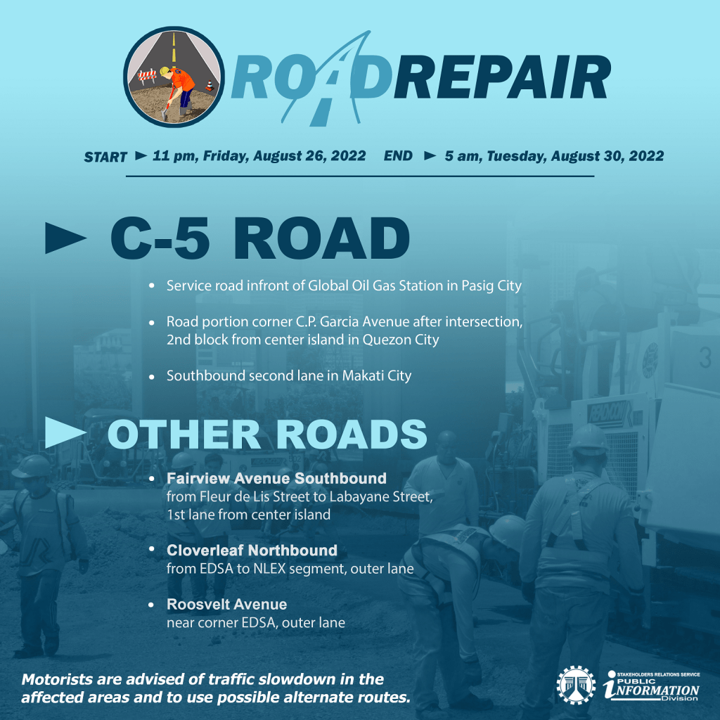 Samantala, sa C-5, service road sa harap ng Global Oil Gas Station sa Pasig City, may isasagawang pasasaayos sa panulukan ng C.P. Garcia Avenue, 2nd block mula sa center island sa Quezon City at southbound second lane sa Makati City na isasara para sa reblocking.