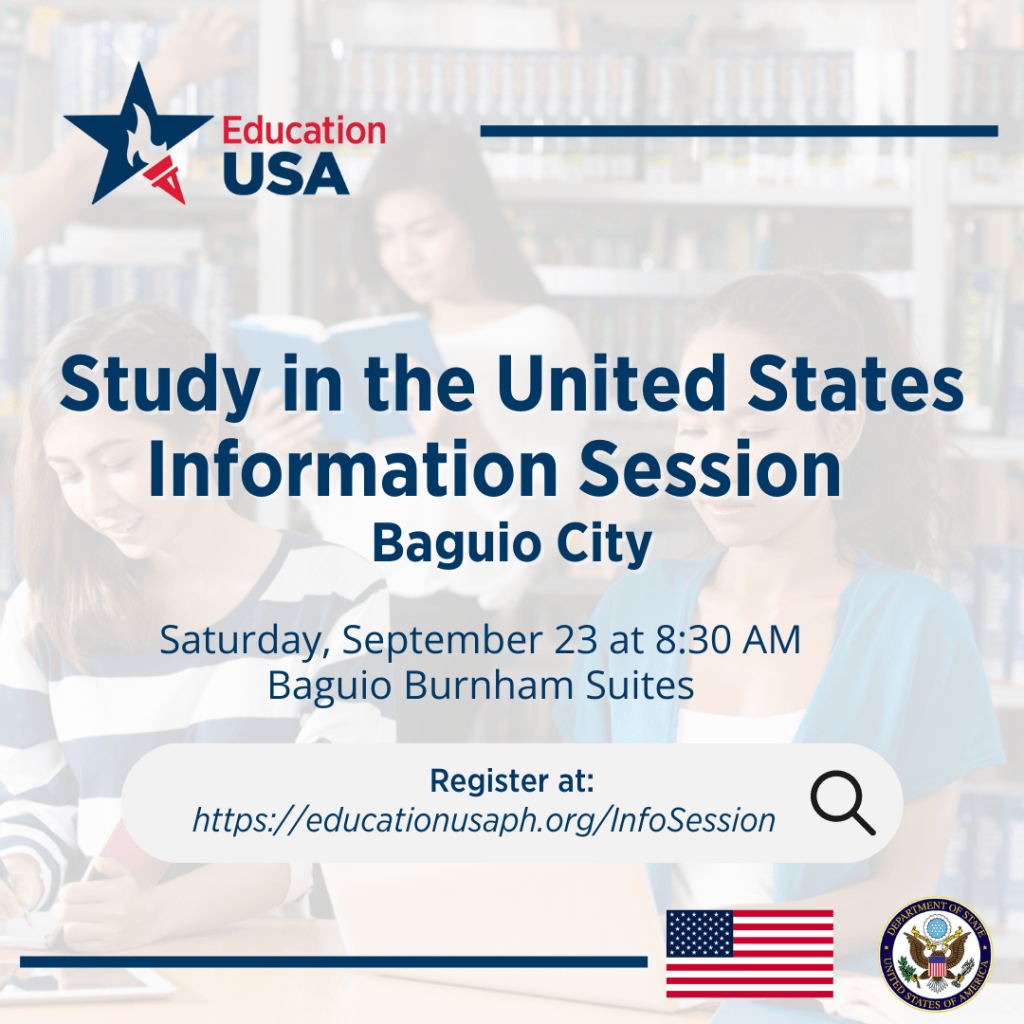 EducationUSA, the U.S. government’s official resource on U.S. higher education, invites prospective students from the Cordillera region to join its free “Study in the United States” information session on September 23 at the Baguio Burnham Suites in Baguio City.