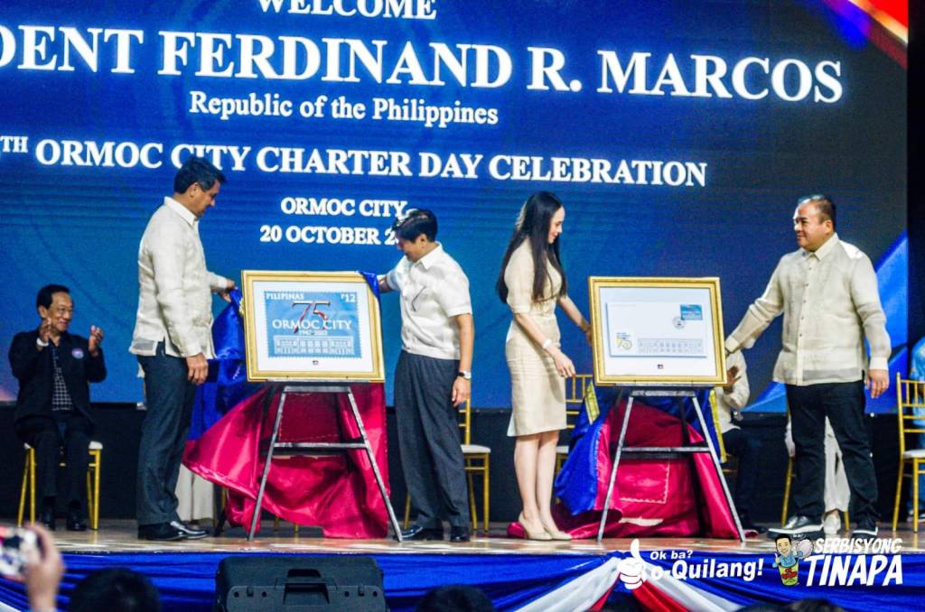 Pinangunahan ni Pangulong Ferdinand “Bongbong” Marcos, kasama sina Ormoc City Mayor Lucy Torres-Gomez, Fourth District Leyte Rep. Richard Gomez at Post Master General Norman Fulgencio ng PhilPost, ang pag-unveil ng commemorative stamp ng 75-year Diamond Jubilee year ng Ormoc City.