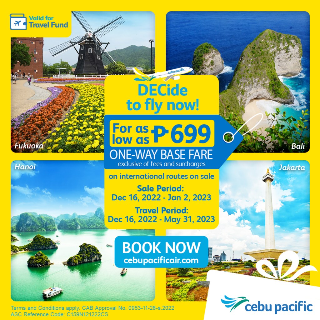 Beginning 10 a.m on December 16, 2022, until January 2, 2023, passengers may avail themselves of tickets for as low as PHP 699 one-way base fare (exclusive of fees and surcharges).