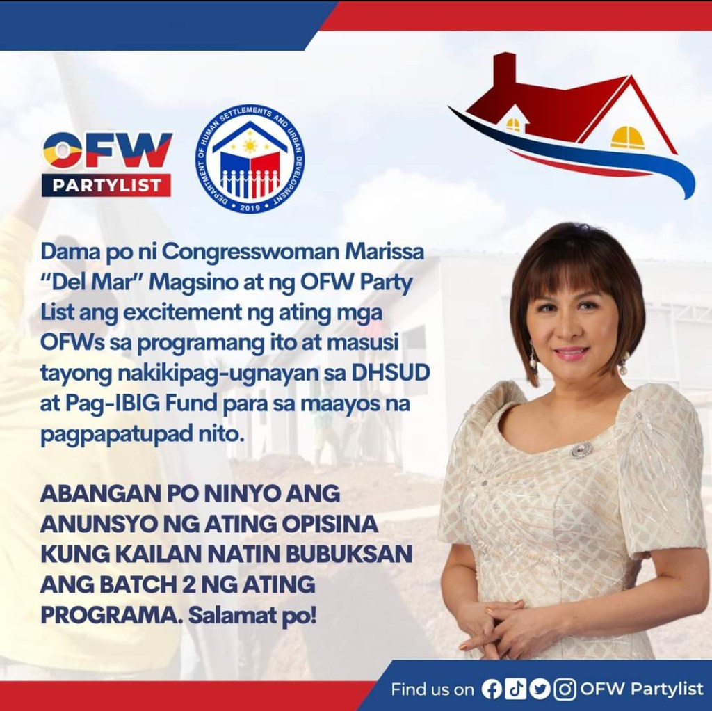 Sa Facebook porst, sinasabing sa isinagawang pulong ng technical working group (TWG) ng Department of Human Settlements and Urban Development (DHSUD) at OFW party list, isang maayos na sistema at proseso ang inilatag para sa pag-avail ng aPambansang Pabahay para sa mga OFWs.
