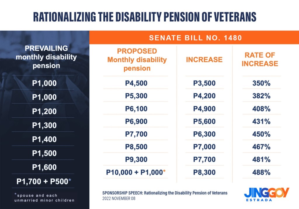 Sa ilalim ng SB 1480 o ang iminungkahing batas na Rationalizing the Disability Pension of Veterans, ang base rate ng disability pension ay itataas sa P4,500 mula sa kasalukuyang natatanggap na P1,000. Ito ay may katumbas na pagtaas na 350%.