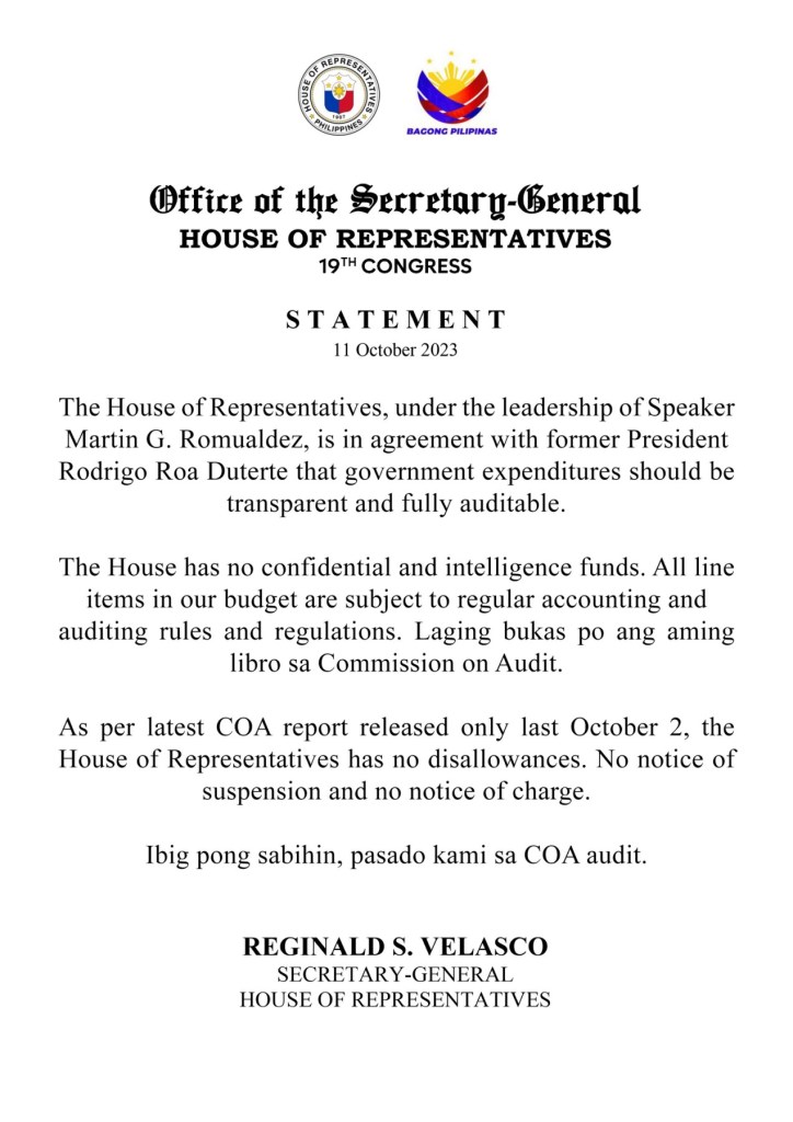 “The House has no confidential and intelligence funds. All line items in our budget are subject to regular accounting and auditing rules and regulations. Laging bukas po ang aming libro sa Commission on Audit,” sabi pa ni Velasco.