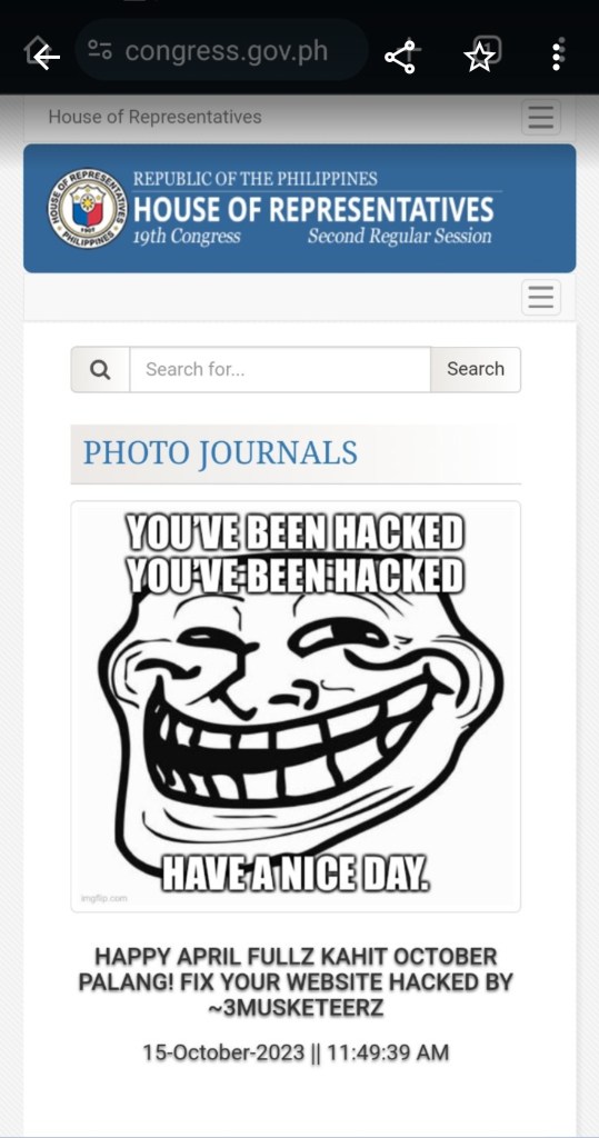 Sa inilabas na kalatas ni House SecGen. Reginald “Reggie” Sagun Velasco, na ang website ng Kamara ay pinasok ng hindi matukoy na hacker.
