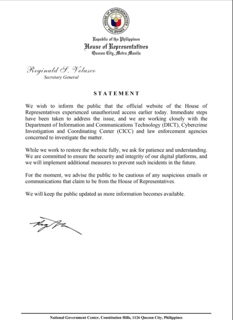Sa pahayag na inilabas ni House Secretary General Reginald Sagun Velasco, nagdesisyon ito na pansamantalang hindi magamit ng publiko ang website ng Kamara habang isinasagawa ang pagsisiyasat.