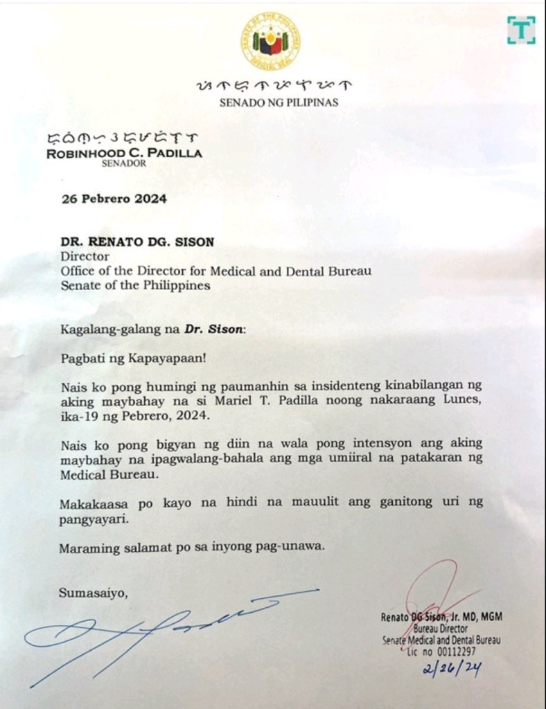 Sa kanyang liham na ipinadala ni Padilla kay Dr. Renato DG Sison, direktor ng Medical and Dental Bureau; at kay (Ret) Lt. Gen. Roberto T. Ancan, sergeant-at-arms ng Senado.