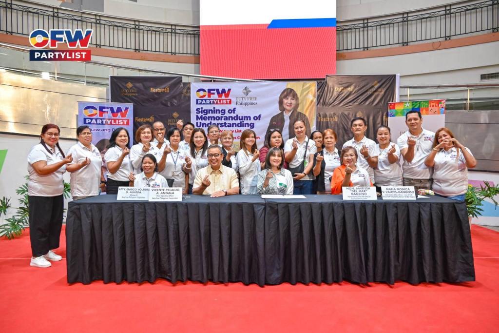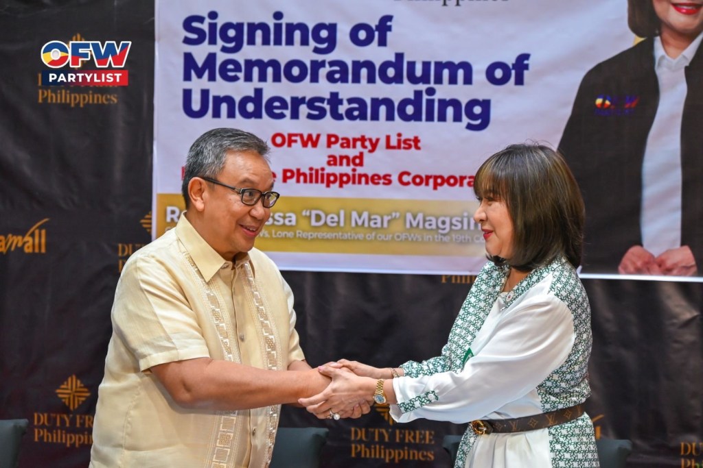 Bilang pagkilala sa mga overseas Filipino workers (OFWs) na mga makabagong bayani at sa hindi natitinag na pangako ng OFW party list na mapabuti ang buhay ng mga migranteng manggagawa, nilagdaan ni OFW party list Rep. Marissa “Del Mar” Magsino at Duty Free Philippines Corporation (DFPC) ang isang memorandum of understanding (MoU) para magbigay ng eksklusibong diskuwento sa mga miyembro ng partido.